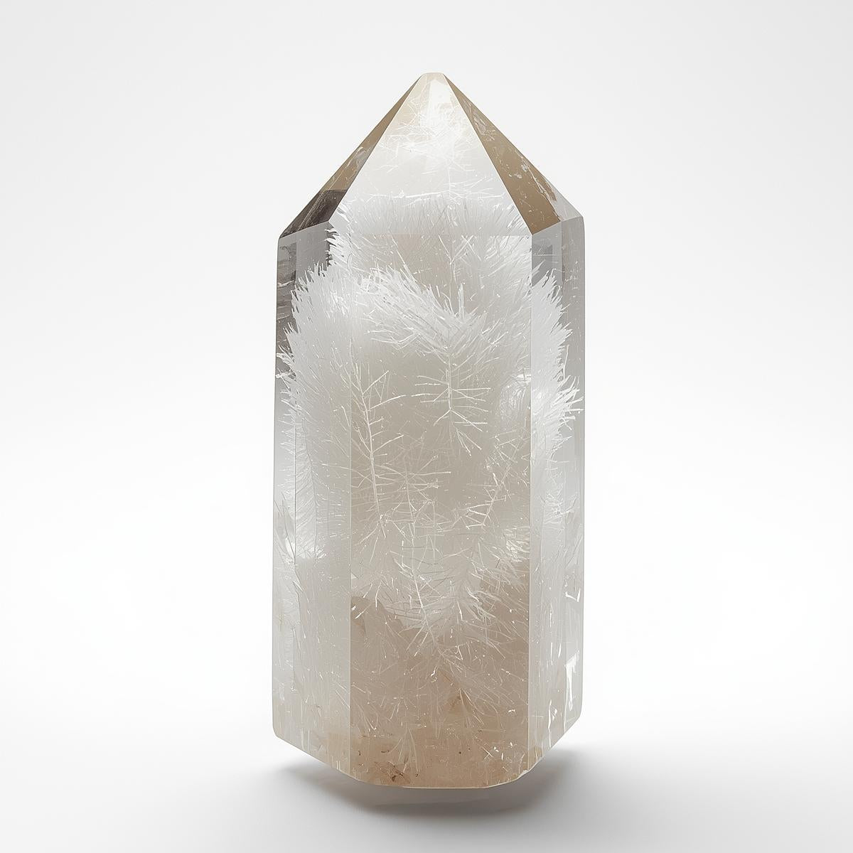 White Rutilated Quartz, often referred to as “White Rabbit Hair Quartz,” is a unique and delicate variety of quartz distinguished by its soft, fibrous white inclusions suspended within a clear or milky crystal body. These fine, hair-like formations are created naturally during crystal growth by minerals such as rutile or related compounds, forming patterns that resemble floating strands of light. The result is a crystal that feels gentle, refined, and deeply calming.