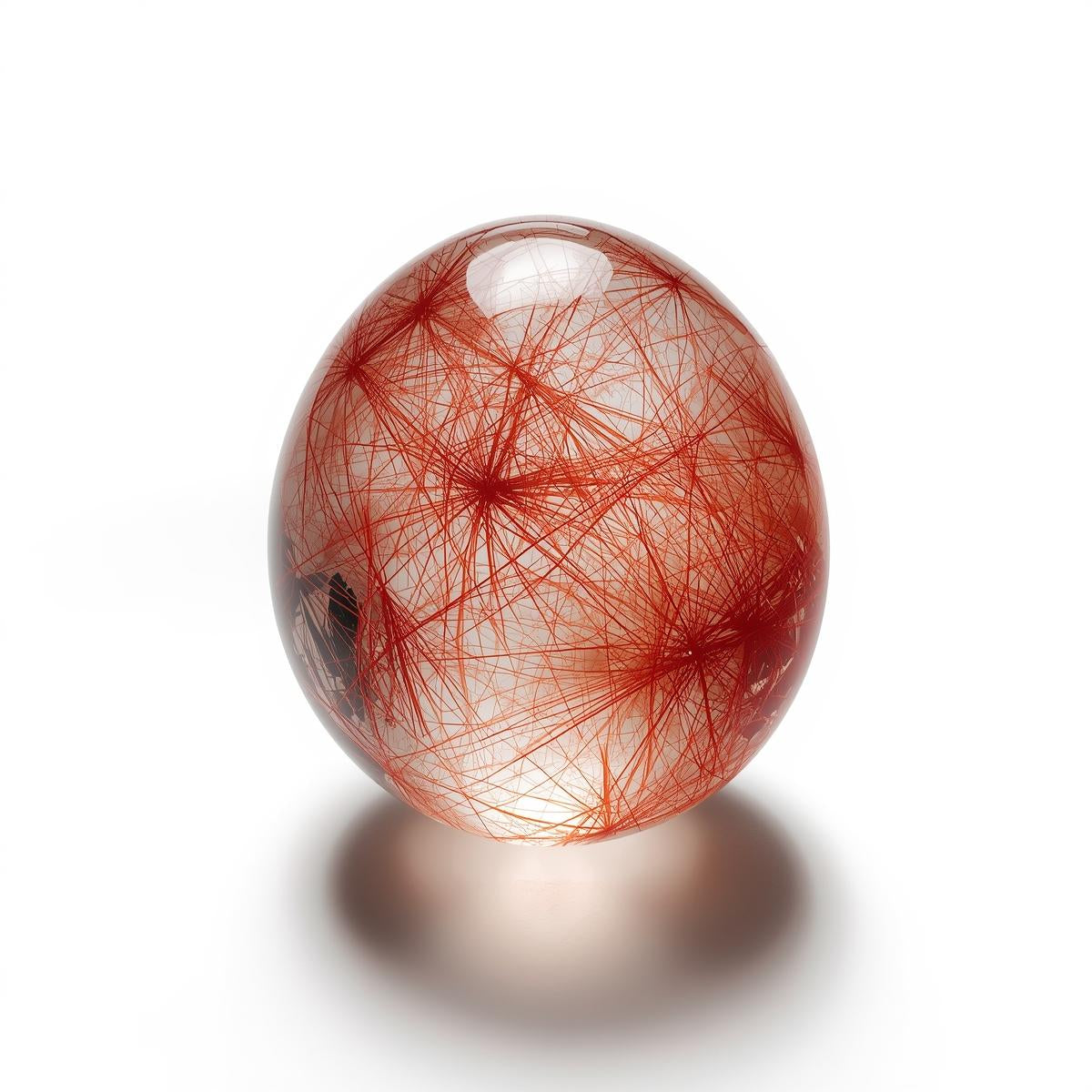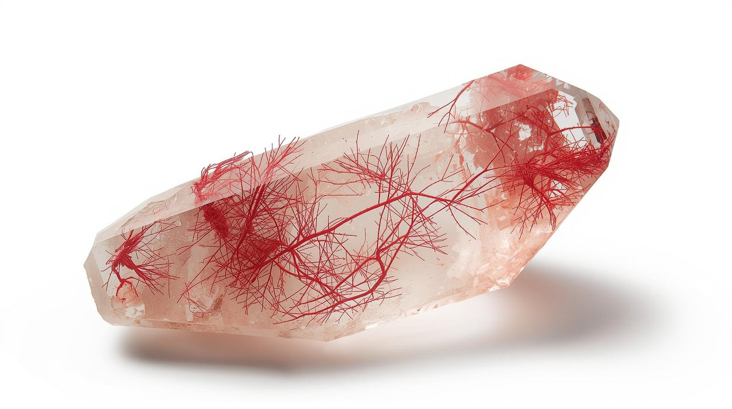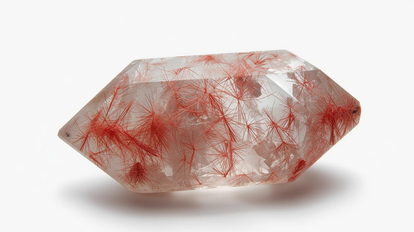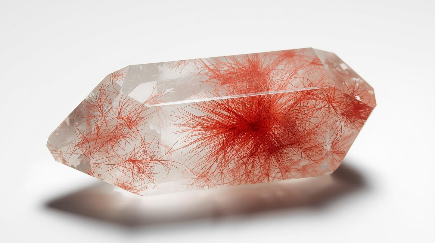 红金红石石英是一种稀有且极具价值的石英品种,其显著特征是晶体内部悬浮着鲜艳的红色纤维状包裹体,这些包裹体呈透明或半透明状。这些细小的金红石丝在晶体生长过程中自然形成,构成动态的内部纹理,象征着运动、温暖和生命力。与表面着色的宝石不同,红金红石石英的颜色源自其内部,赋予其深邃的内涵、真实的质感和持久的能量。