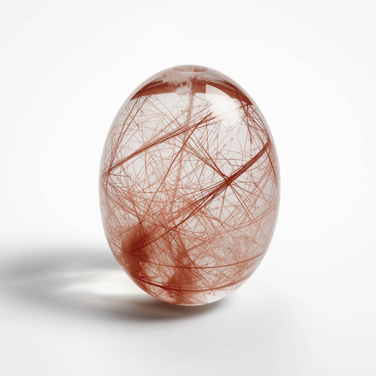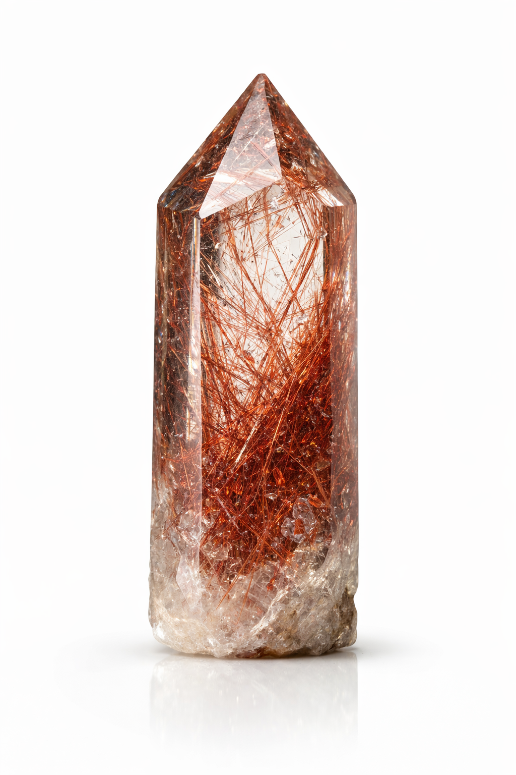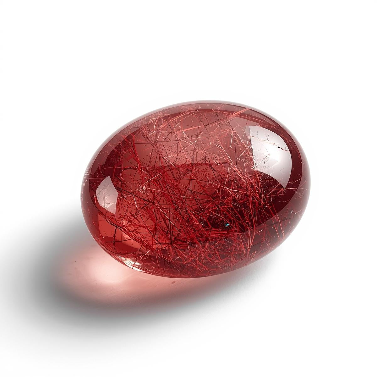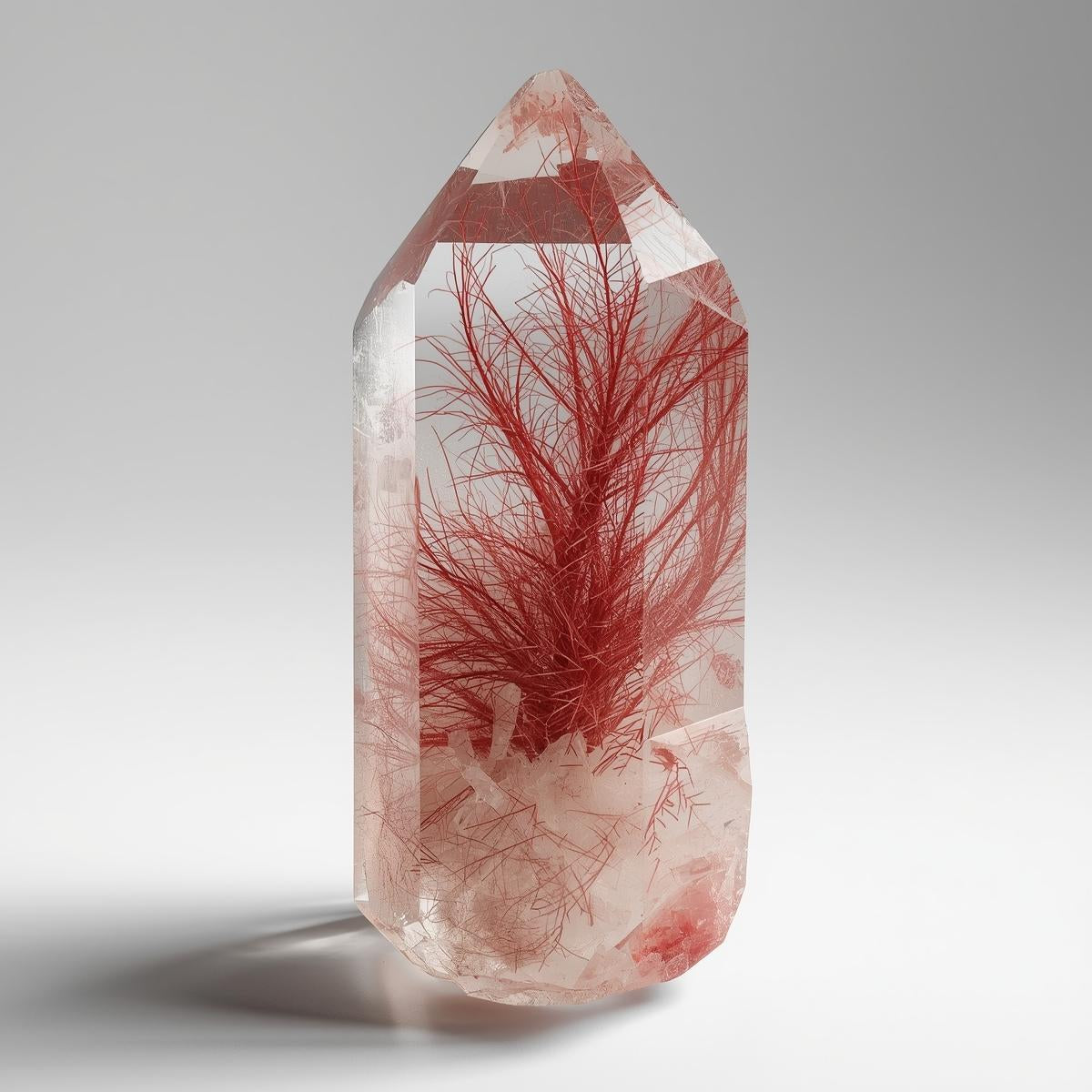 红金红石石英是一种稀有且极具价值的石英品种,其显著特征是晶体内部悬浮着鲜艳的红色纤维状包裹体,这些包裹体呈透明或半透明状。这些细小的金红石丝在晶体生长过程中自然形成,构成动态的内部纹理,象征着运动、温暖和生命力。与表面着色的宝石不同,红金红石石英的颜色源自其内部,赋予其深邃的内涵、真实的质感和持久的能量。